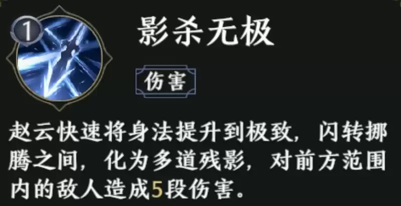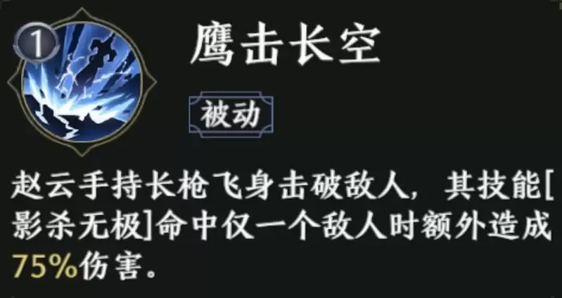 其伤害技能【影杀无极】乍看只是平平无奇的5段伤害技,但搭配其被动【鹰击长空】,可使赵云的【影杀无极】在仅命中一个敌人时额外造成75%的额外伤害,在对战单个敌人时,赵云可通过该技能快速压低敌方血条。