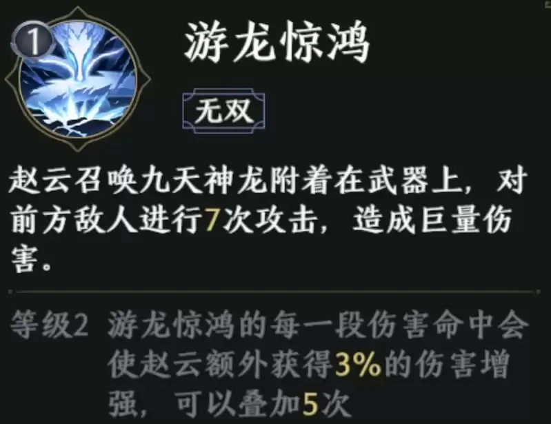其无双技【游龙惊鸿】,可谓是帅气与伤害并存,在该技能达到2级后,不仅可以造成7段巨量伤害,且每一段伤害命中敌人后,还能为赵云叠加至多5次的3%伤害强化。无双技结束后,在高额的伤害强化下,搭配【影杀无极】对单个敌人的高伤害加持,“一波带走”不是梦。