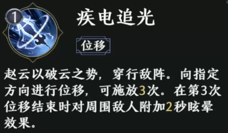 赵云的位移技能【疾电追光】可进行3段冲刺位移,并且第3段冲刺结束后可对敌方造成2秒眩晕,该技能搭配闪行,四重位移完全可以在战斗中重现长坂坡的“四进四出”!