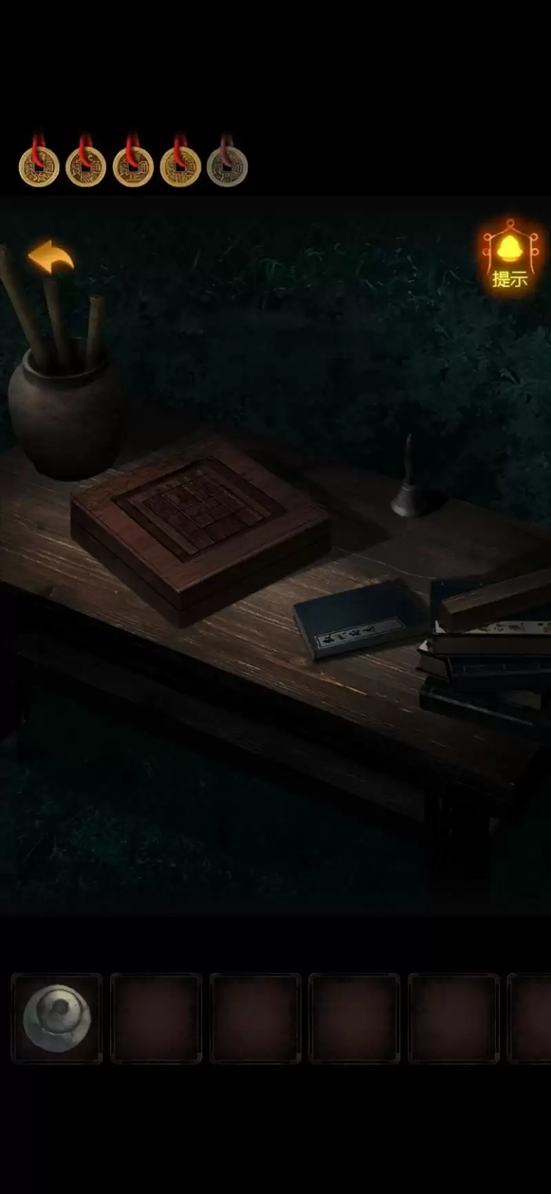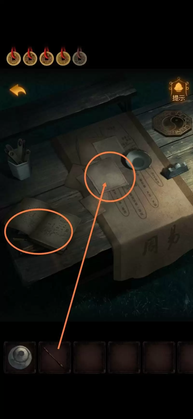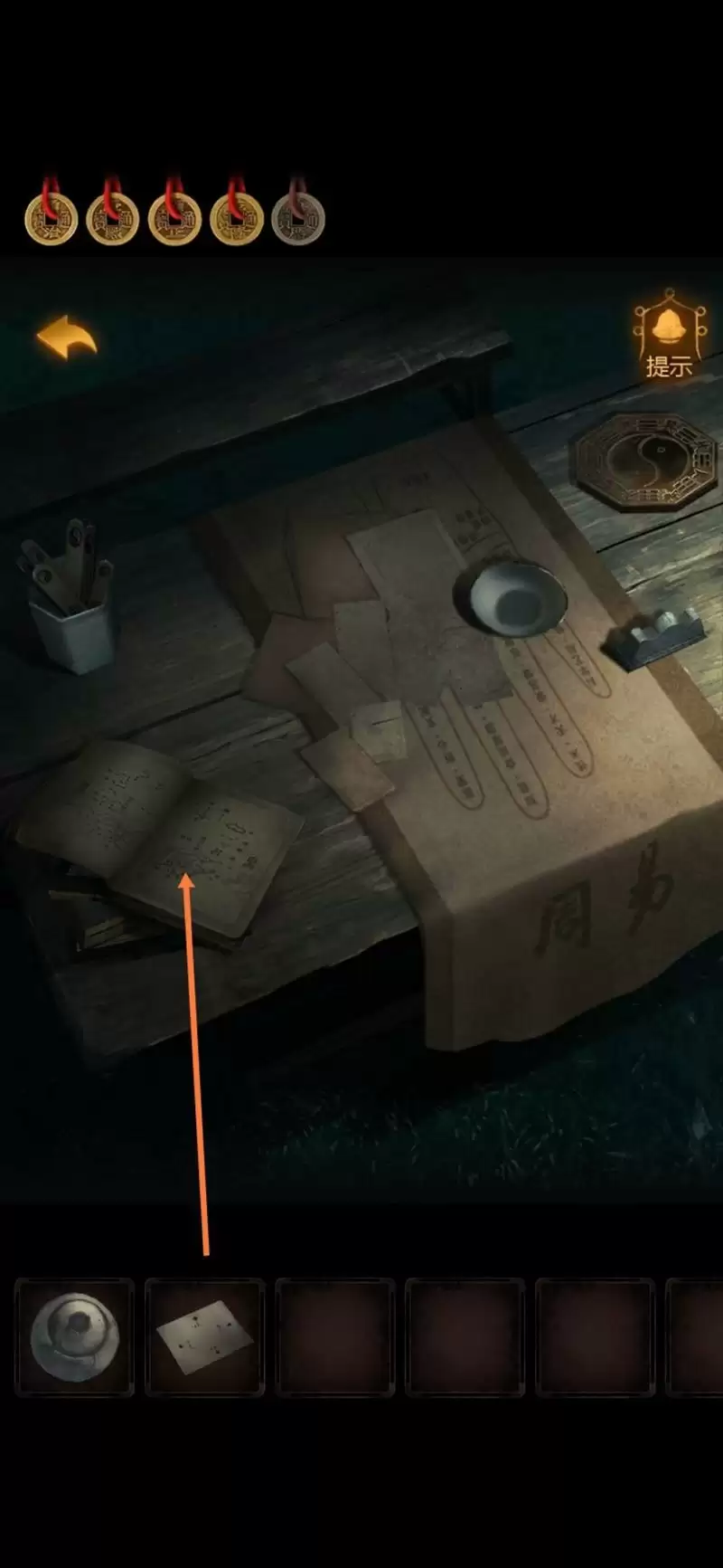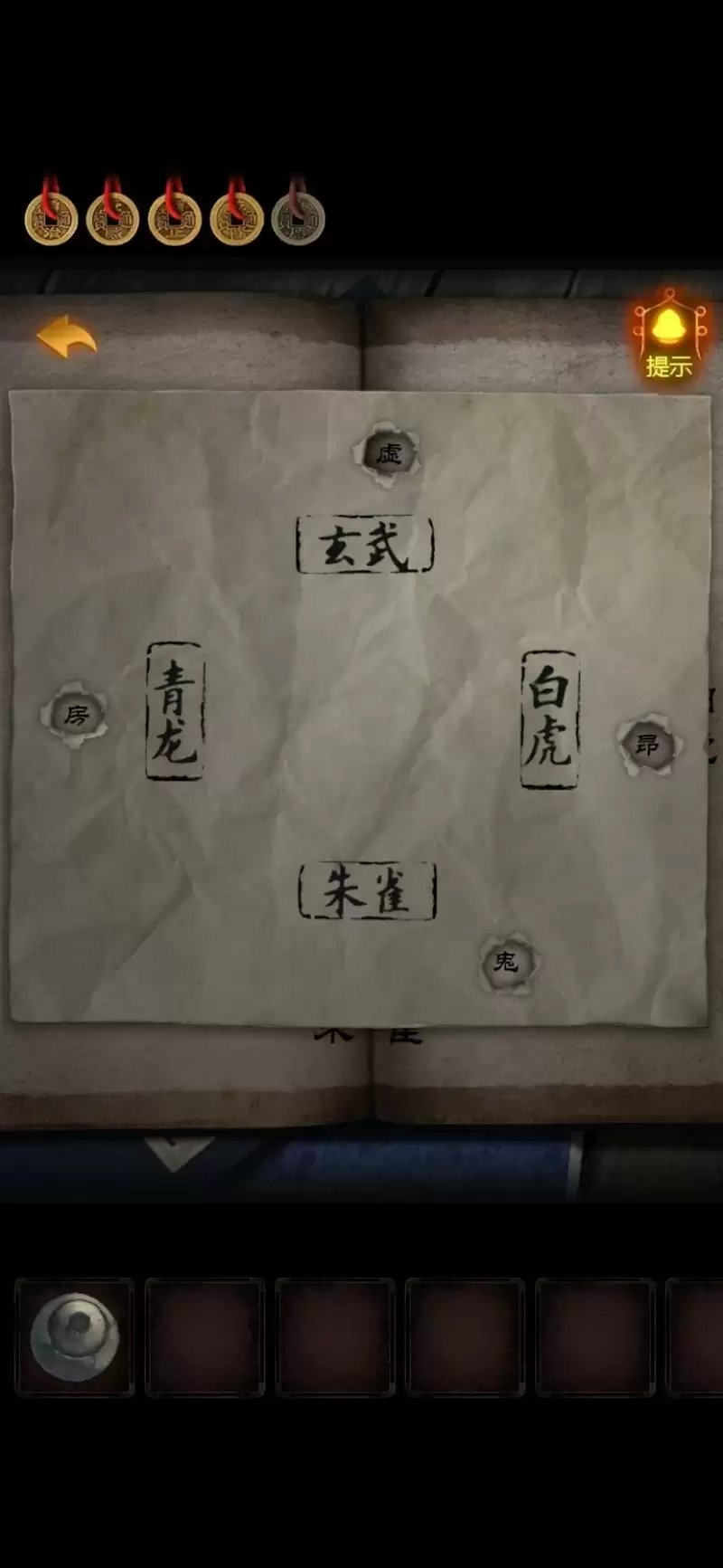 10.回到外面的卦摊,把【卡片】放在卦书上,卡片的洞洞显示出线索。有点眼熟,是地道左下角的盒子哒!