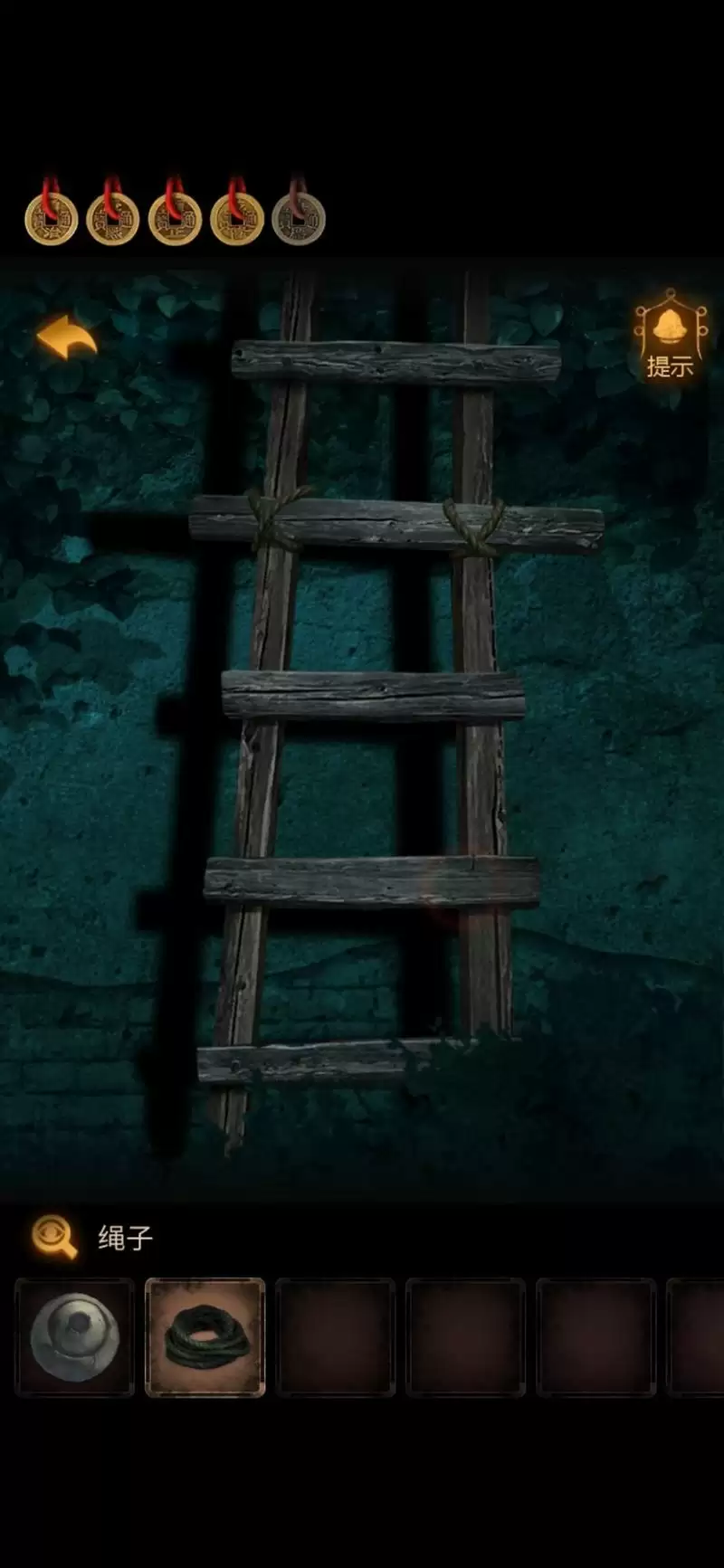 7.进院子,到右边围墙旁用【木板】和【绳子】修一副坏掉的【梯子】。