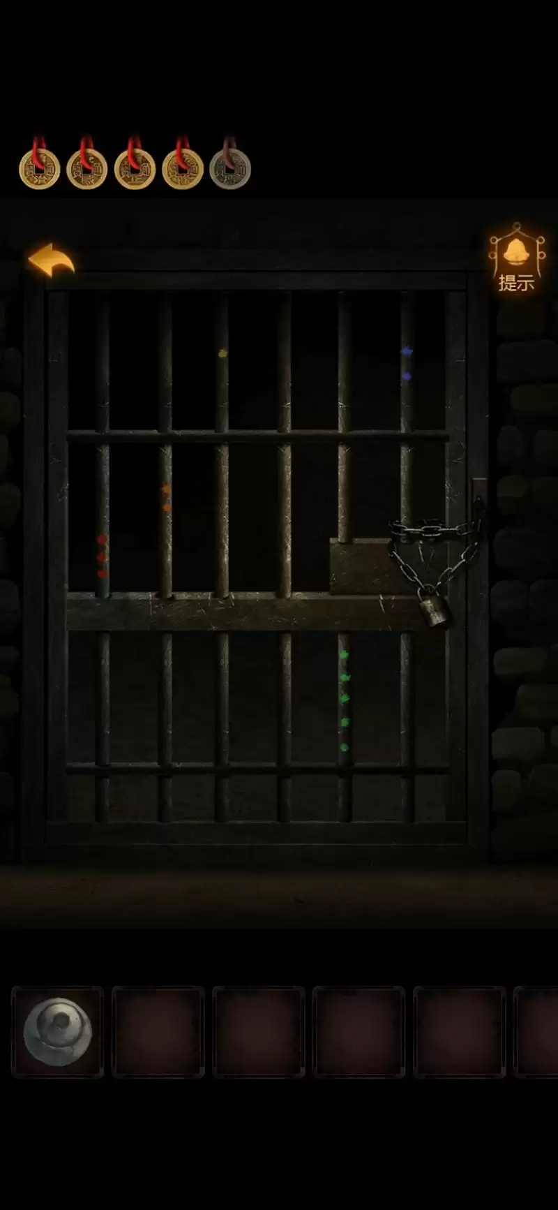 9.井下是个地道,往里是锁起来的铁门。门上有几个彩色点,红3,橙2,黄1,绿5,蓝2。