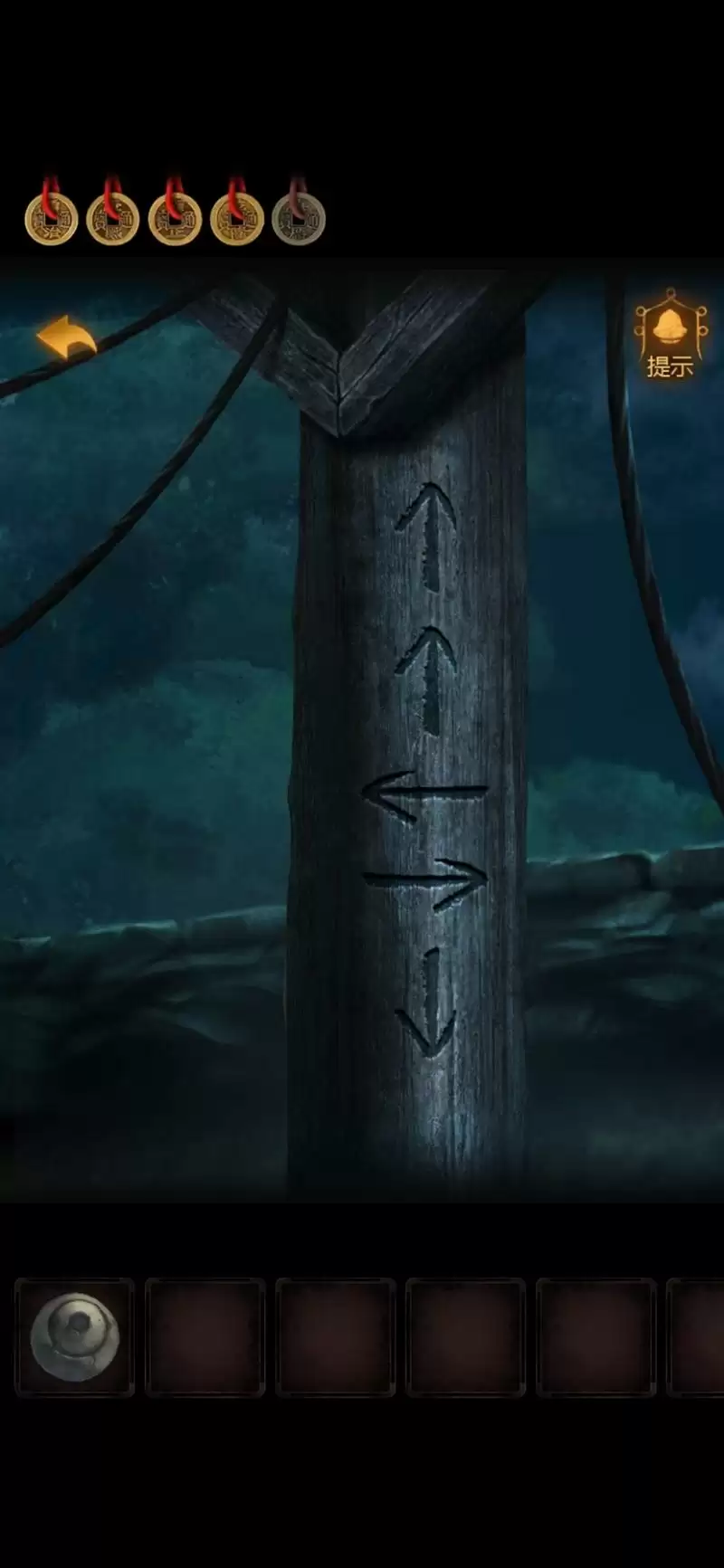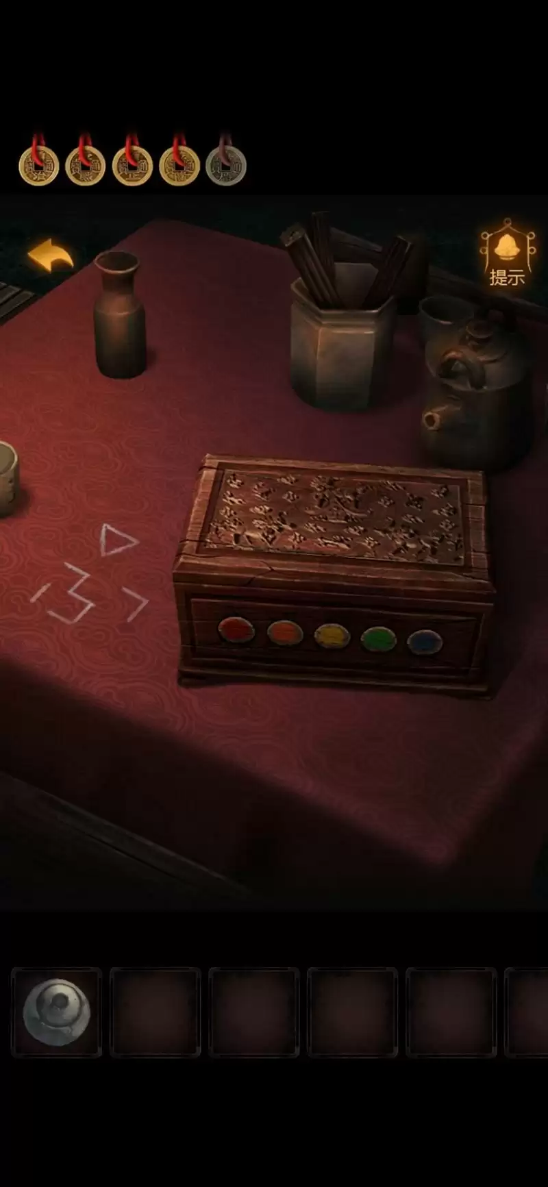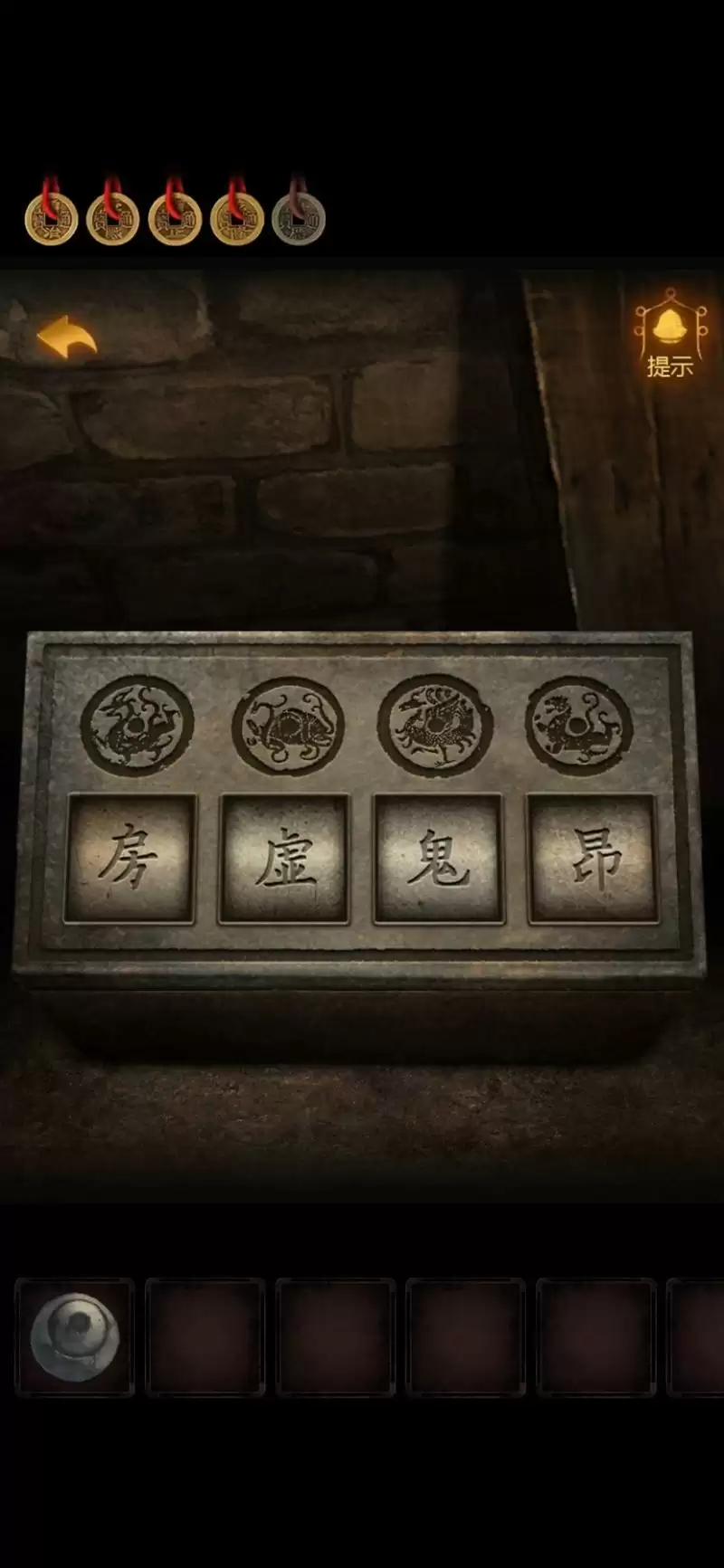 按↑↑←→↓,打开机关,发现线索板。上面的图案有点眼熟,刚才牢房床下的盒子上差不多来着。