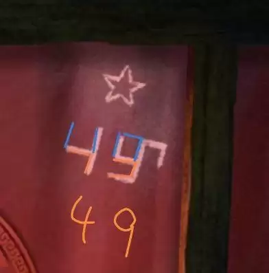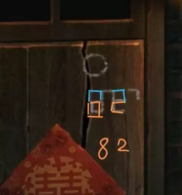 房门口捡几个【木板】,顺便发现门板上【符号线索3】。