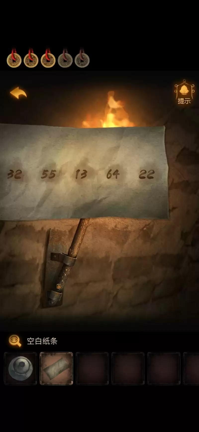 回地道,把【纸条】在左边墙上的火把上烤,纸条上显示出密码。