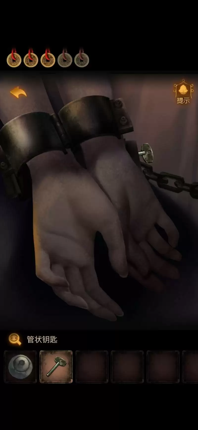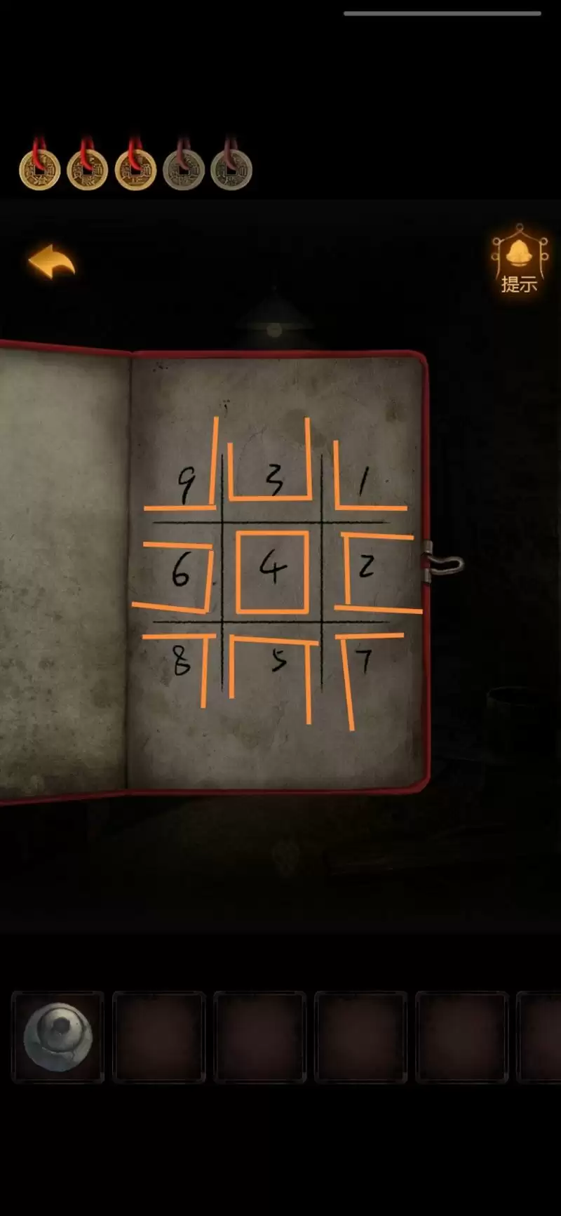 根据刚才密码本上的密码,发现就是九宫格的每一个格子。输入942538,打开盒子,拿到【手铐钥匙】。
