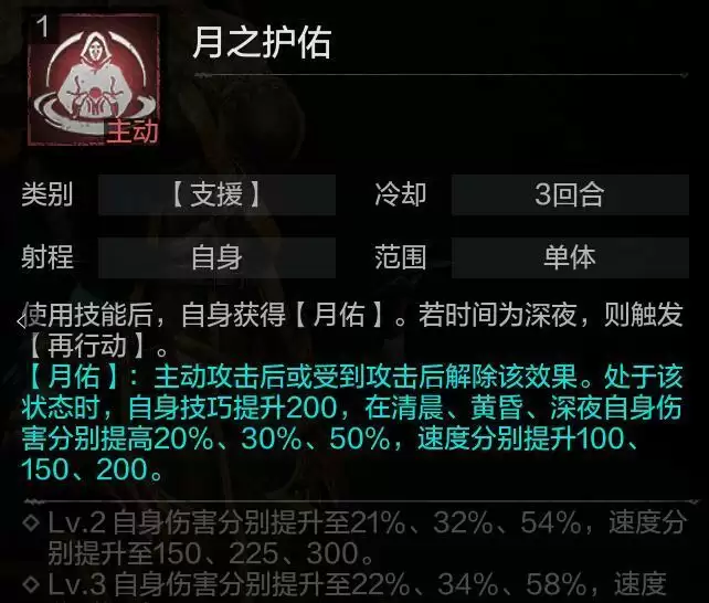 该技能在使用后,可以使得唤月者获得月佑效果:处于该状态时,唤月者的技巧(影响暴击率)可以提升200,自身的伤害、速度(影响回避率)会在清晨、黄昏、深夜获得的提升逐步增加,特别是在深夜,将获得最高提升。