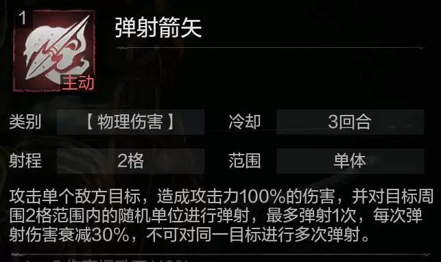 弹射箭矢是一个标准的单体伤害技能,并附加了额外的弹射效果。该技能配合月之护佑技能开启后的状态,在夜晚能够最大化唤月者的输出,且能够对单体敌军造成伤害外,还可对目标周围2格范围内的敌军进行弹射伤害。