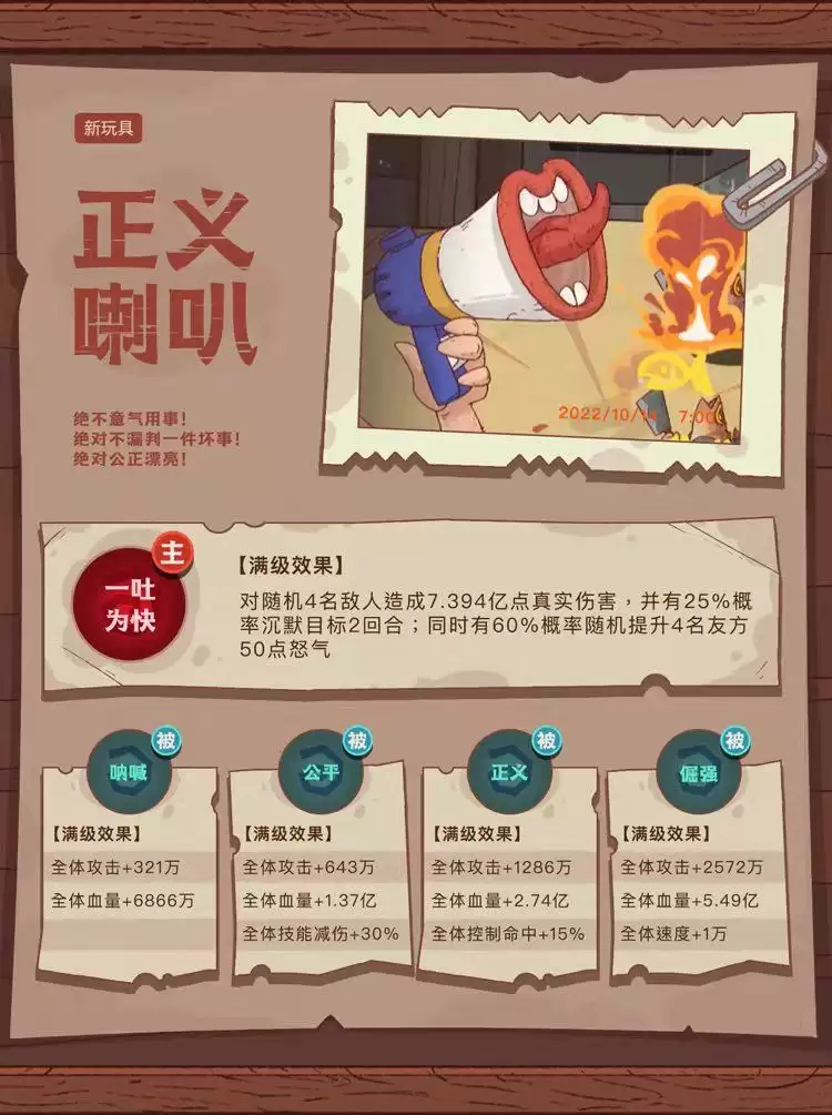 1、正义喇叭技能效果如图:被动为技能减伤和控制命中,主动沉默+怒气