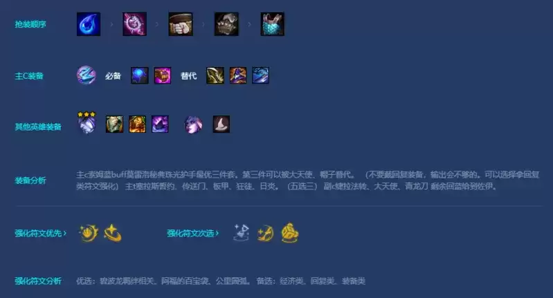 开局首抢装备眼泪或者法棒。 做出最为核心的蓝buff和莫雷洛秘典给到卡莎打工。 前期用三星界三法师三碧波龙过渡 斯卡纳、弗拉基米尔、拉克丝、墨菲特、塔莉亚、卡莎。可以充分的发挥经济上的积累且战力也不错。