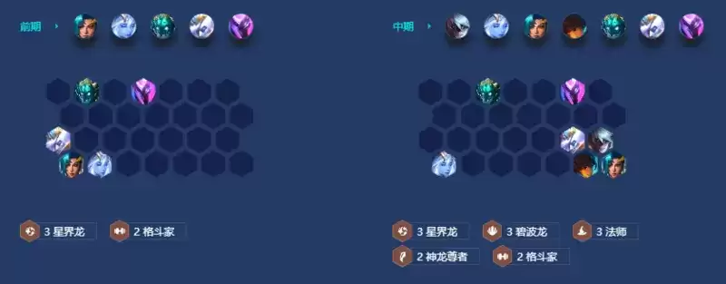 抢节奏升人口, 1-4拉四、2-2拉五、3-1拉六。 一般情况都能在3-5七(经济积累的很快)然后小搜一点质量。补一个神龙尊者,提升卡莎输出。 4-2拉八人口,大搜卡钱花完,把阵容凑齐即可。星界龙加碧波龙的经济足够支撑到八。 八人口阵容成型后,四阶段基本可以吃个大连胜。等到索姆两星落就可以存钱,够钱以后果断拉人口。上巴德或者索拉卡。