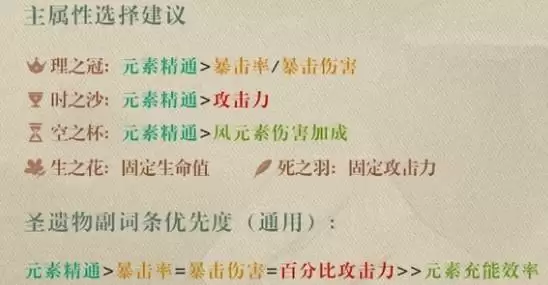 圣遗物主属性选择:沙漏—元素精通,杯子—风元素伤害加成、帽子—暴击率或爆伤;