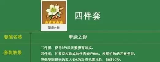 2件 15%风元素伤害,4件 60%扩散伤害,扩散元素类型抗性-40秒。