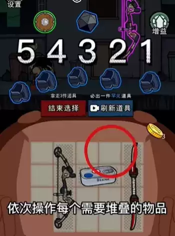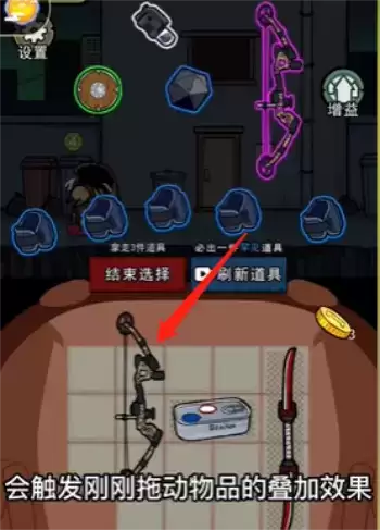 3、然后再点击桌上的其他物品,如弓箭或者是盒子,上下移动一下,最上面摆放的物品就会开始叠加起来。