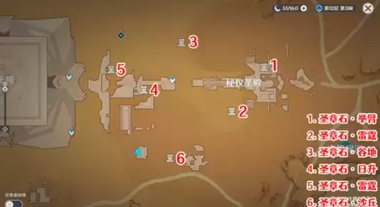 秘仪圣殿西侧区域圣章石位置如图所示,一共有六个。