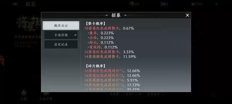 武将招募卡池里只有红将和橙将,没有金将!!!。红将分18资质和16资质。新手30抽必出16资质,100抽必出18资质。个人推荐18资质赵云>小乔>夏侯惇>董卓。小乔排前面因为是唯一好看的女将,而且不是0氪强迫症的推荐花6元能能拿一个小乔。招募获得的积分可以兑换武将碎片。建议养夏侯惇或者小乔,有梦想的毅力帝可以换孙坚。个人不推荐白嫖党换孙坚,甚至不推荐用元宝抽招募,建议元宝用于武将列传。