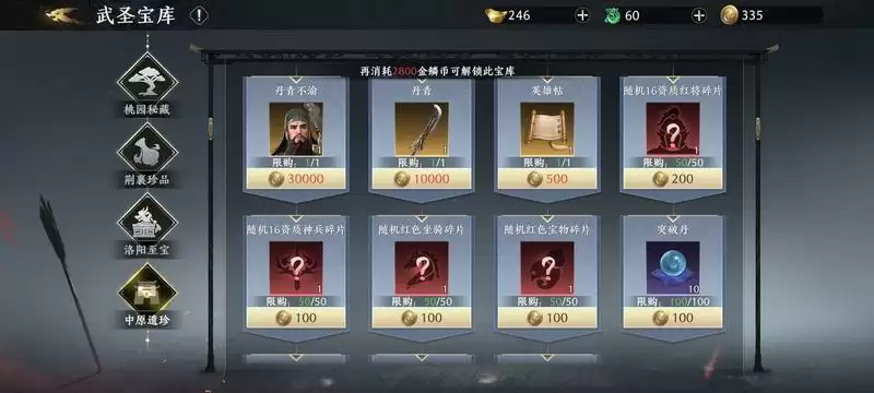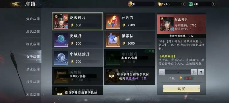 内测体验到的第一个列传是关羽,看关羽碎片获取方式估计后面会不断出各种金将的列传。列传每天能用元宝买次数,60元宝3次能买5回。每天300元宝这个必买。商店奖励兑换优先级是抽卡道具(攒4000元宝20抽)>宝物碎片>坐骑碎片>16资质武器碎片>16资质武将碎片>一般材料。最后一层有关羽时装和武器时装。列传抽卡兑换金碎。