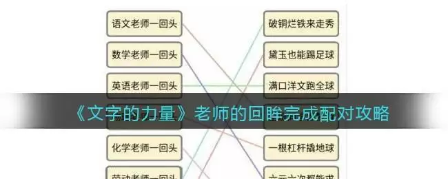 文字的力量是抖音上目前很火的精彩益智烧脑解谜闯关游戏,游戏中老师的回眸完成配对怎么过?这一关连线词给的很有意思,大概很多小伙伴不清楚怎么连,今天小编就给大家带来了抖音小游戏《文字的力量》老师的回眸完成配对攻略,希望对大家有帮助哦!