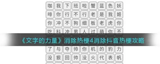 文字的力量是抖音上目前很火的精彩益智烧脑解谜闯关游戏,游戏中消除热梗4怎么过?这一关要求消除抖音热梗,都是近期抖音上最近流行的梗,如果玩抖音比较多基本都知道,今天小编就给大家带来了抖音小游戏《文字的力