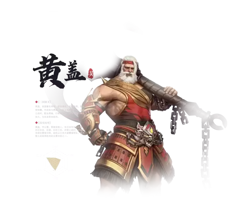 史:黄盖,字公覆,零陵泉陵人。东汉末年东吴名将,历仕孙坚、孙策、孙权三任。赤壁之战时,黄盖奉命前往曹营诈降,趁机以火攻大破曹操军队,是赤壁之战取得胜利的主要功臣之一。