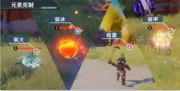游戏中的元素克制效果为强弱克制,克制关系如下图所示,在怪物的血条下方会有一个小小的圆形图标,图标标注的属性就是当前怪物的弱点了,大家可以根据这些怪物的特点以及图标来选择武器进行战斗。