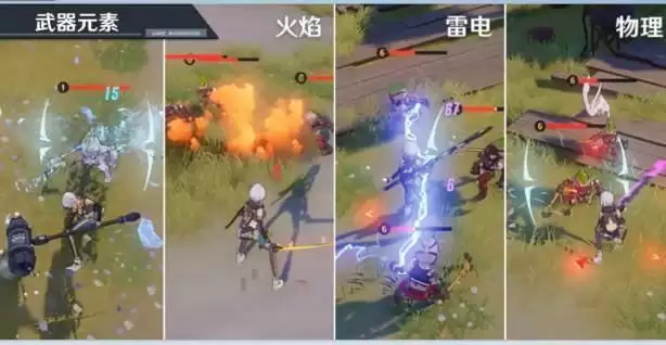 武器有火焰、寒冰、雷电、物理四种不同的属性。使用以上元素的武器攻击对人,会对敌人造成冰冻、燃烧、短路以及重伤等效果,进一步提升输出能力。