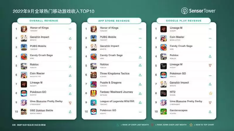 Sensor Tower 商店情报数据显示,2022年9月腾讯《王者荣耀》在全球 App Store 和 Google Play 吸金近1.9亿美元,蝉联全球手游畅销榜冠军。来自中国iOS市场的收入占94.5%,海外市场收入占比为5.5%。