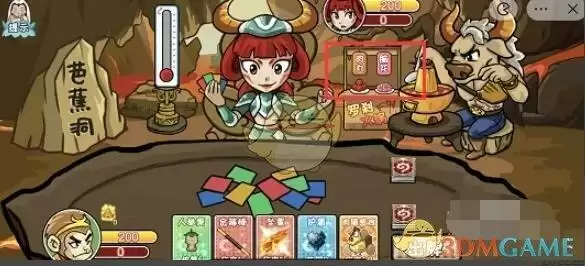 6、然后把大闹天空打出去,然后打出去还没胜利,玩家可以按照上方的牌再次合成,再打出赢得胜利即可,如果没有可以合成的,就先使用攻击牌,慢慢耗,只要把她血条打空就行。