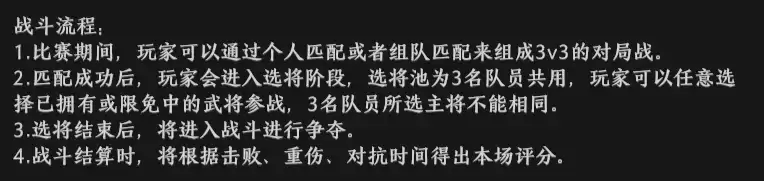 《极无双2》三军争霸玩法技巧公平竞技中的3v3(三军争霸)玩法,和1v1(谁与争锋)一样,都是去除数值的公平玩法。相较于1v1而言,3v3是组队的PK,更需要团队合作。今天就给大家来总结下3v3的获胜小技巧~欢迎大家交流不同的意见。一、3v3(三军争霸)的基本介绍 简单来说,3v3是去除数值的多人公平PK。你可以自行和好友组队,也可以随机匹配。具体流程可以看下面↓