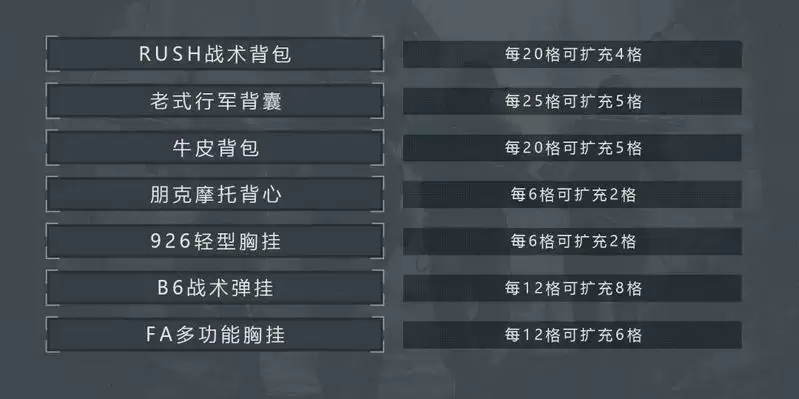 首先使用老式行军包,里面套一个牛皮背包和926轻型弹挂,还能剩余4格空间,牛皮背包里套RUSH战术包,可剩余5格空间,RUSH战术包里套2个B6战术胸挂。总共可用空间为4+8+5+20+20=57格,相较扩充前的30格共扩容27格。