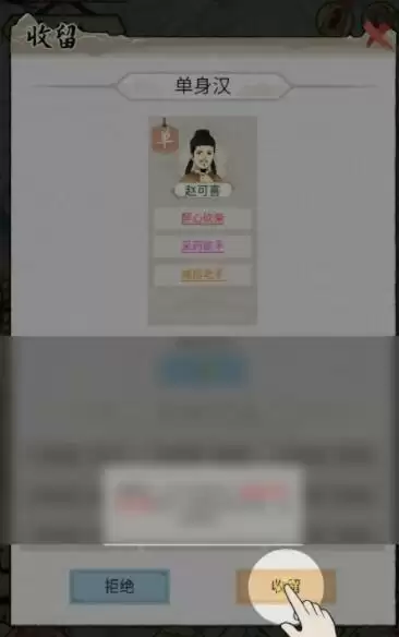 3、点击“收留”按钮后,收留来访的单身汉村民即可。