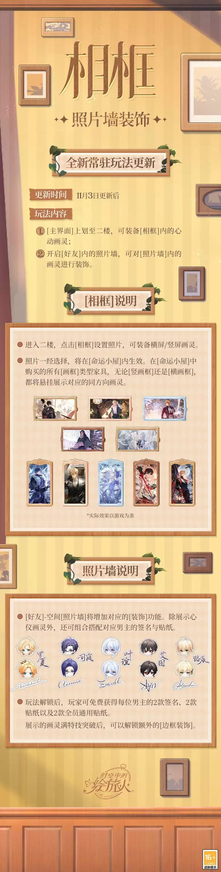 2、[好友]-空间[照片墙]新增装饰功能,支持组合搭配对应男主的签名与贴纸。初始免费解锁每位男主的2款签名、2款贴纸及2款全员通用贴纸。画灵满特技突破后还可解锁额外[边框贴纸]。
