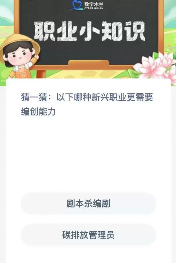 2022支付宝蚂蚁新村11月2日的题目已经更新了,今天的题目为:以下哪种新兴职业更需要编创能力?正确答案是什么?剧本杀编剧还是碳排放管理员呢?很多小伙伴可能还不太清楚。下面小编就为大家带来了正确答案分享,希望能帮助到你。