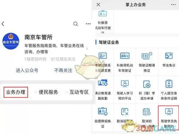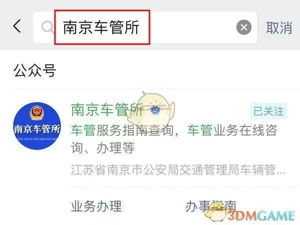 2、在微信app中搜索本地的车管所微信公众号(本教程以南京为例)。