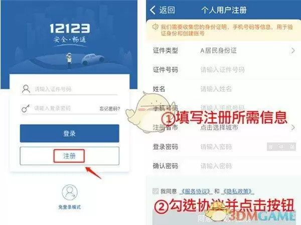 1、开启交管12123软件,选择注册,将个人注册信息填写完成,勾选协议并点击完成即可。