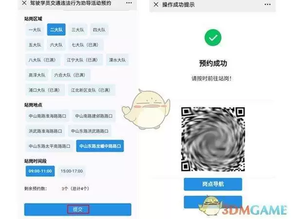 6、将站岗区域、站岗地点、站岗时间段挑选完成,最后点击提交即可预约成功。