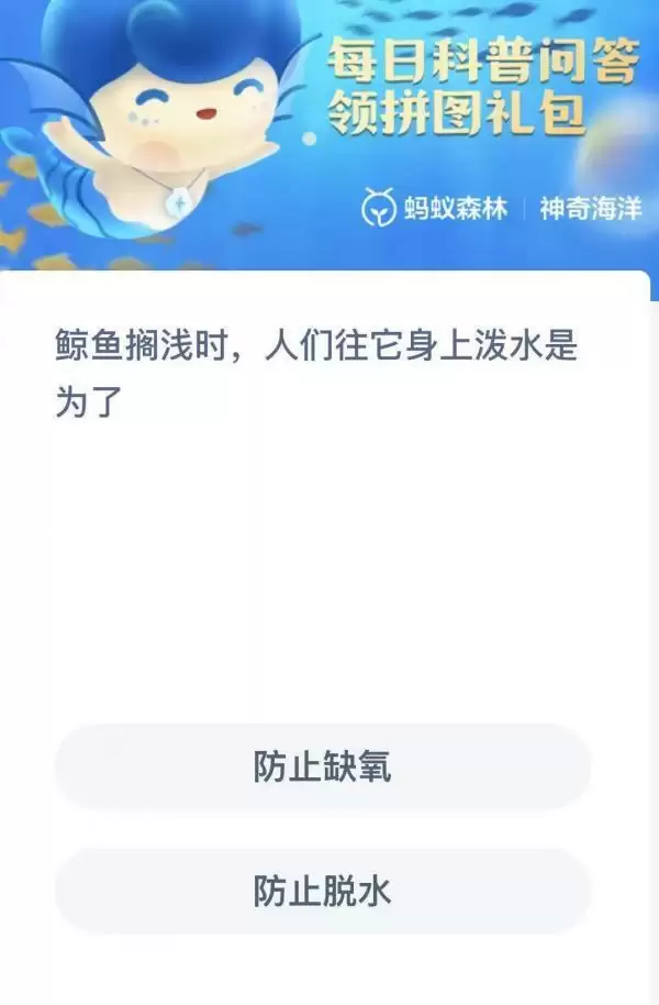 2022支付宝蚂蚁海洋11月3日的题目已经更新了,今天的题目为:鲸鱼搁浅时人们往它身上泼水是为了?防止脱水还是防止缺氧呢?可能很多小伙伴可能还不太清楚正确答案是什么。下面小编就为大家带来了正确答案分享,希望能帮助到你。