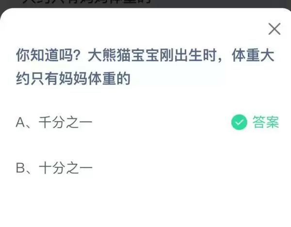 2022支付宝蚂蚁庄园11月5日的题目已经更新了,今天的题目为:大熊猫宝宝刚出生时体重大约只有妈妈体重的?千分之一还是十分之一呢?正确答案是什么,可能很多小伙伴可能还不太清楚。下面小编就为大家带来了正确答案分享,希望能帮助到你。