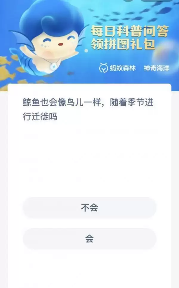 2022支付宝蚂蚁海洋11月4日的题目已经更新了,今天的题目为:鲸鱼也会像鸟儿一样随着季节进行迁徙吗?不会还是会呢?可能很多小伙伴可能还不太清楚正确答案是什么。下面小编就为大家带来了正确答案分享,希望能帮助到你。