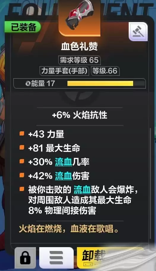流血爆炸:通过便宜的暗金手套 血色礼赞,击败流血敌人时产生爆炸,高效清图。由于暗影术士的天赋点,击中时必定会造成流血,因此覆盖率极高