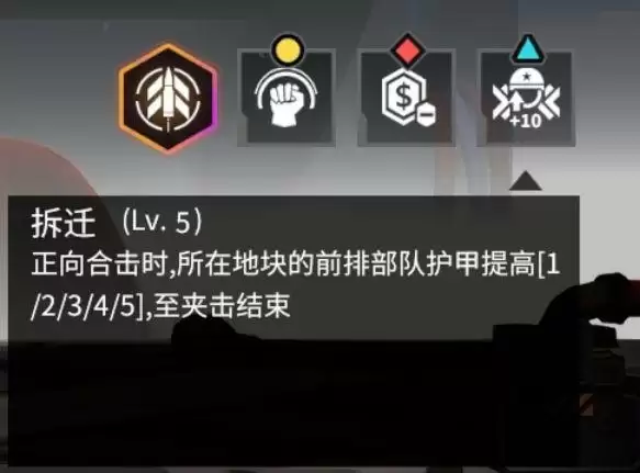 被动技能3:正向合击时,所在地块载具护甲提高。
