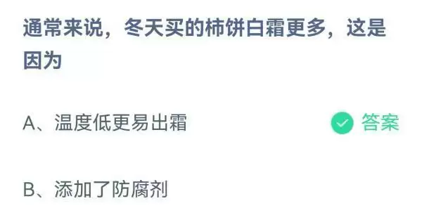 2022支付宝蚂蚁庄园11月10日的题目已经更新了,今天的题目为:通常来说冬天买的柿饼白霜更多这是因为?温度低更易出霜还是添加了防腐剂呢?正确答案是什么,可能很多小伙伴可能还不太清楚。下面小编就为大家带来了正确答案分享,希望能帮助到你。
