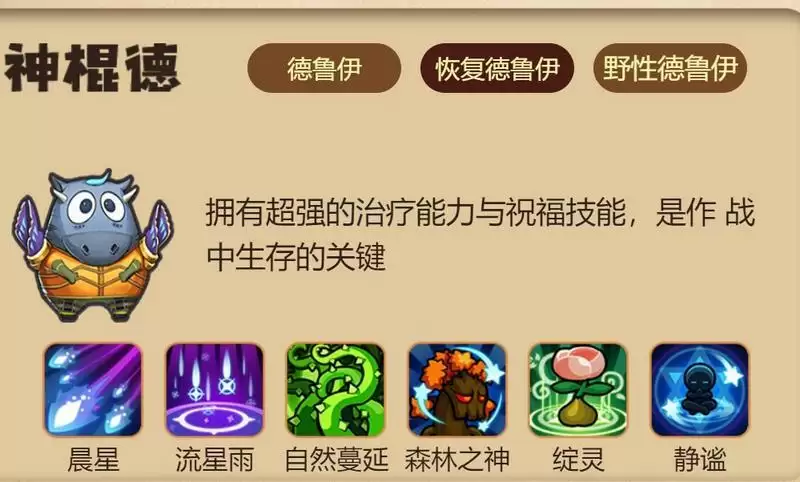 神棍德属于万金油角色,可以当奶妈也可以当坦克,这个角色可以作为团战候补使用,比如整体治疗量不足时可以选择恢复德鲁伊提高生存率。