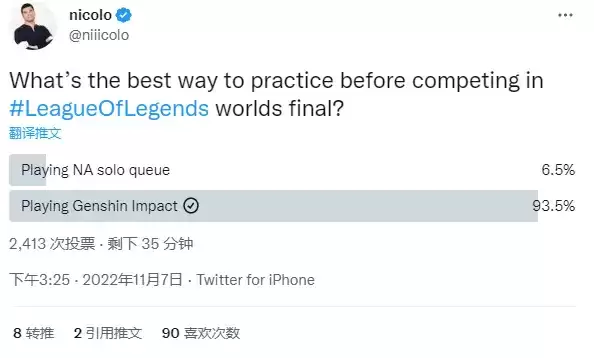 拳头CEO在说完这条帖子的内容后,又发了一个投票问:“进世界赛决赛之前大家最好的练习方式是什么?”93.5%的人投票给了玩原神