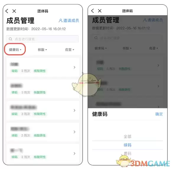 2、成员加入团体后,管理员可以快捷查看团体成员的健康信息,包括粤康码颜色、核酸检测结果、疫苗接种情况等信息,无法查看行程卡或行程等行踪信息。