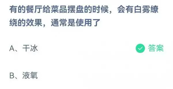 2022支付宝蚂蚁庄园11月11日的题目已经更新了,今天的题目为:有的餐厅给菜品摆盘的时候会有白雾缭绕的效果通常是使用了?干冰还是液氧呢?正确答案是什么,可能很多小伙伴可能还不太清楚。下面小编就为大家带来了正确答案分享,希望能帮助到你。