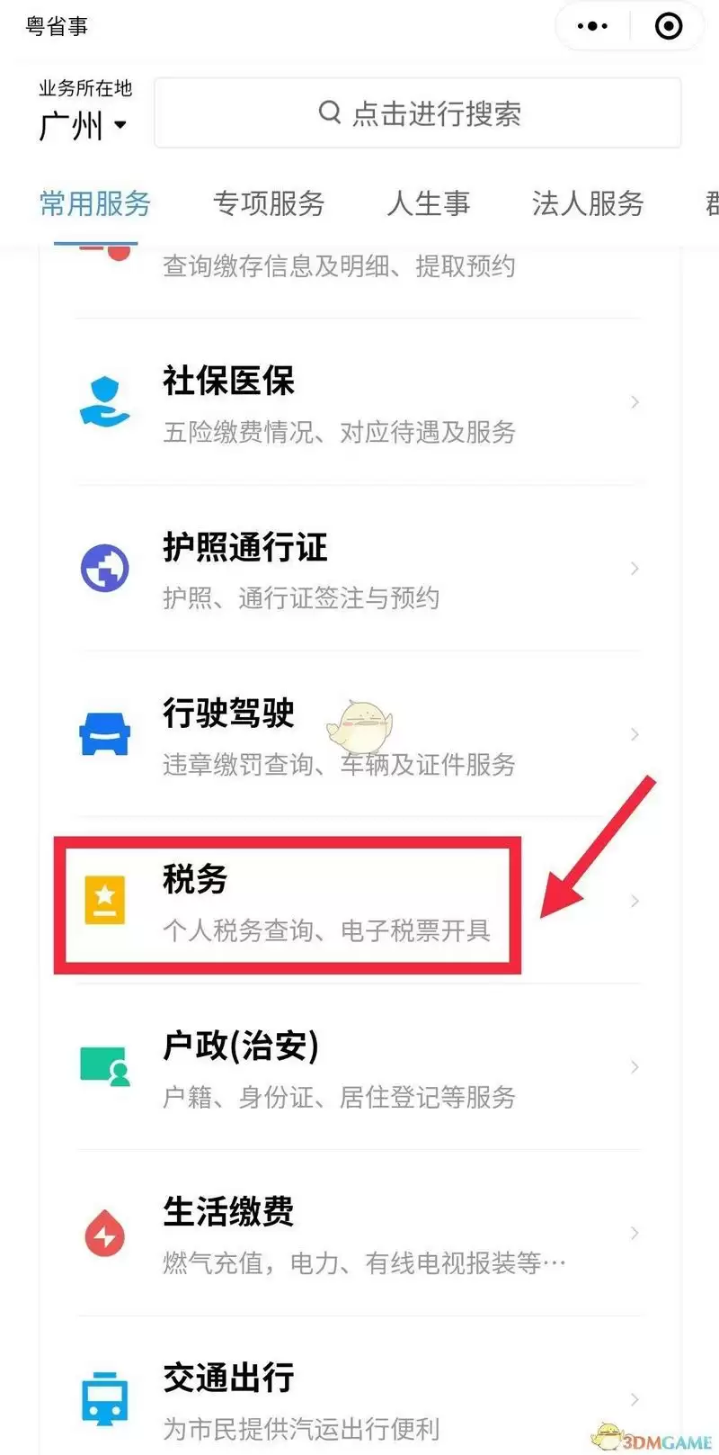 1、微信搜索“粤省事”小程序,并实名登录,在页面中找到“税务”并点击,如下图所示;