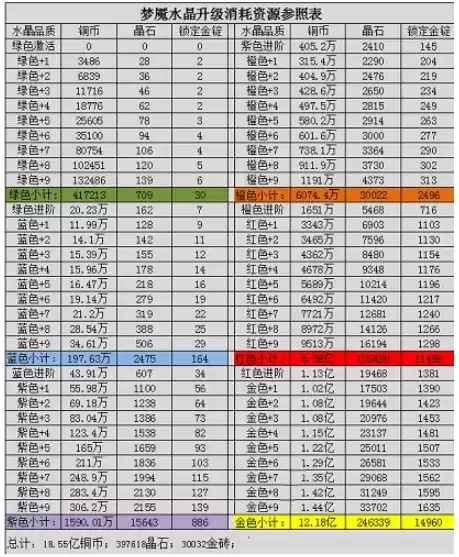 消耗等级分别为绿色、蓝色、紫色、橙色、红色、金色依次递增,并且越往上所需要的资源材料也就越多,品质越高同时也代表属性的提高,总体来说是成正比的,后续的无论关卡或者游戏进度都能有所帮助。接下来小编帮大家整理了各种颜色从+1到+9的详细消耗情况: