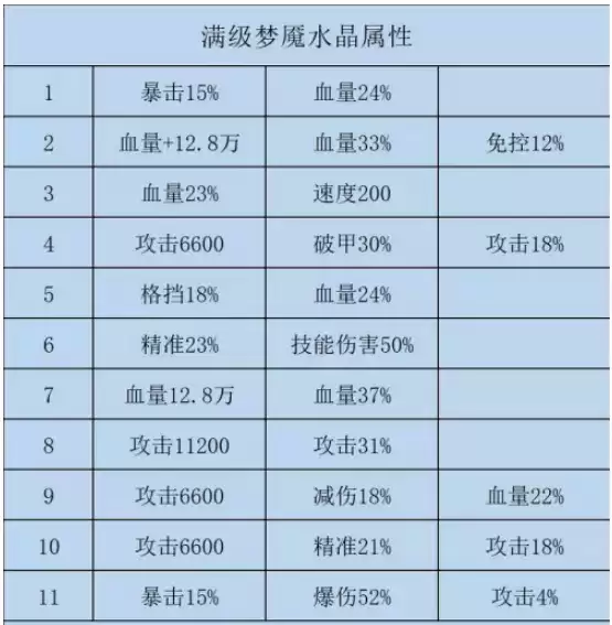 这个梦魇水晶满级属性小编这边就直接使用图表供大家观看了,下面就是详细表。