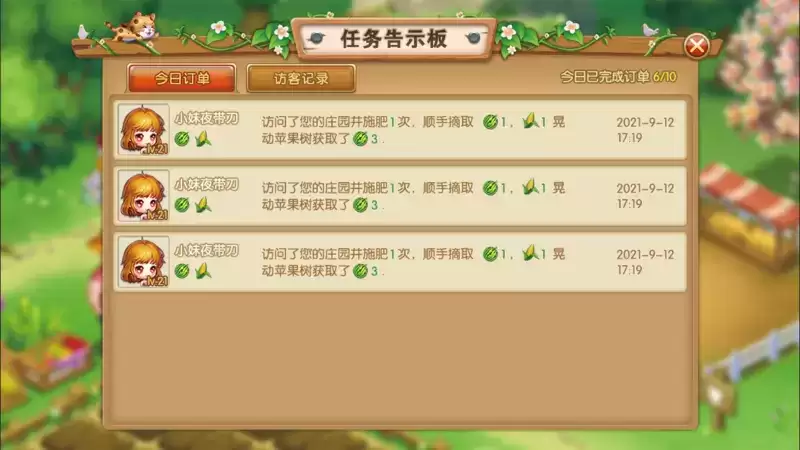 在农场中的公告栏中,我们可以查看农场订单任务和访客记录。玩家每天随机获得一定数量的农场任务。如果对当前的订单不满意,可以尝试点击右上角的刷新按钮刷新任务内容,来获取相对容易的任务。在提交农场内农作物完成这些订单后,就可以获得农场经验来升级农场。